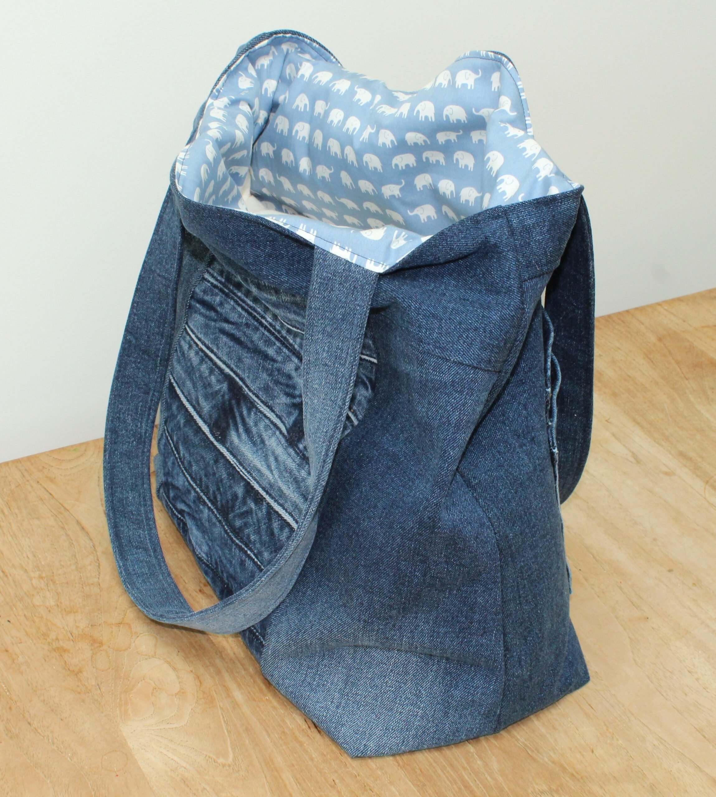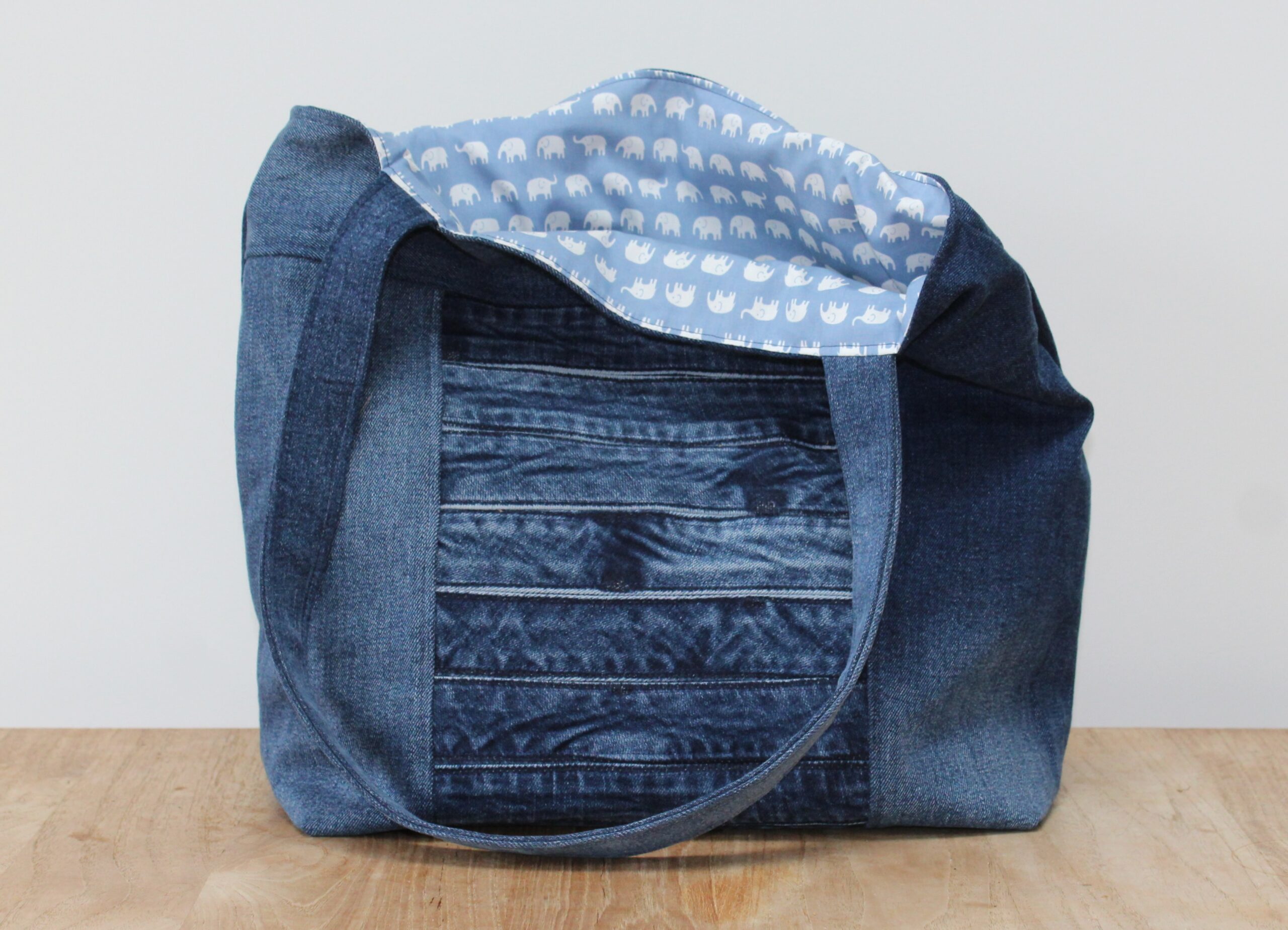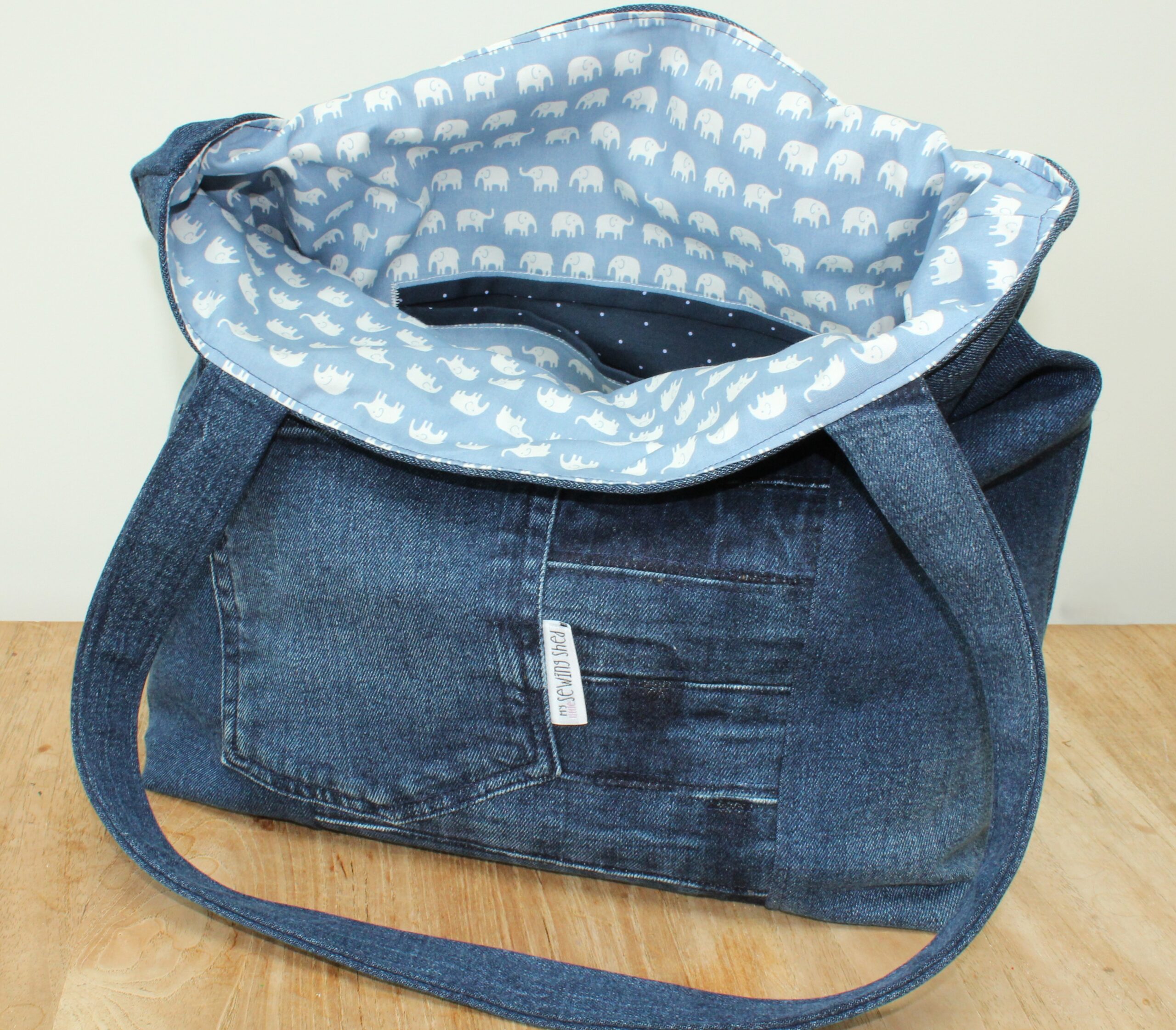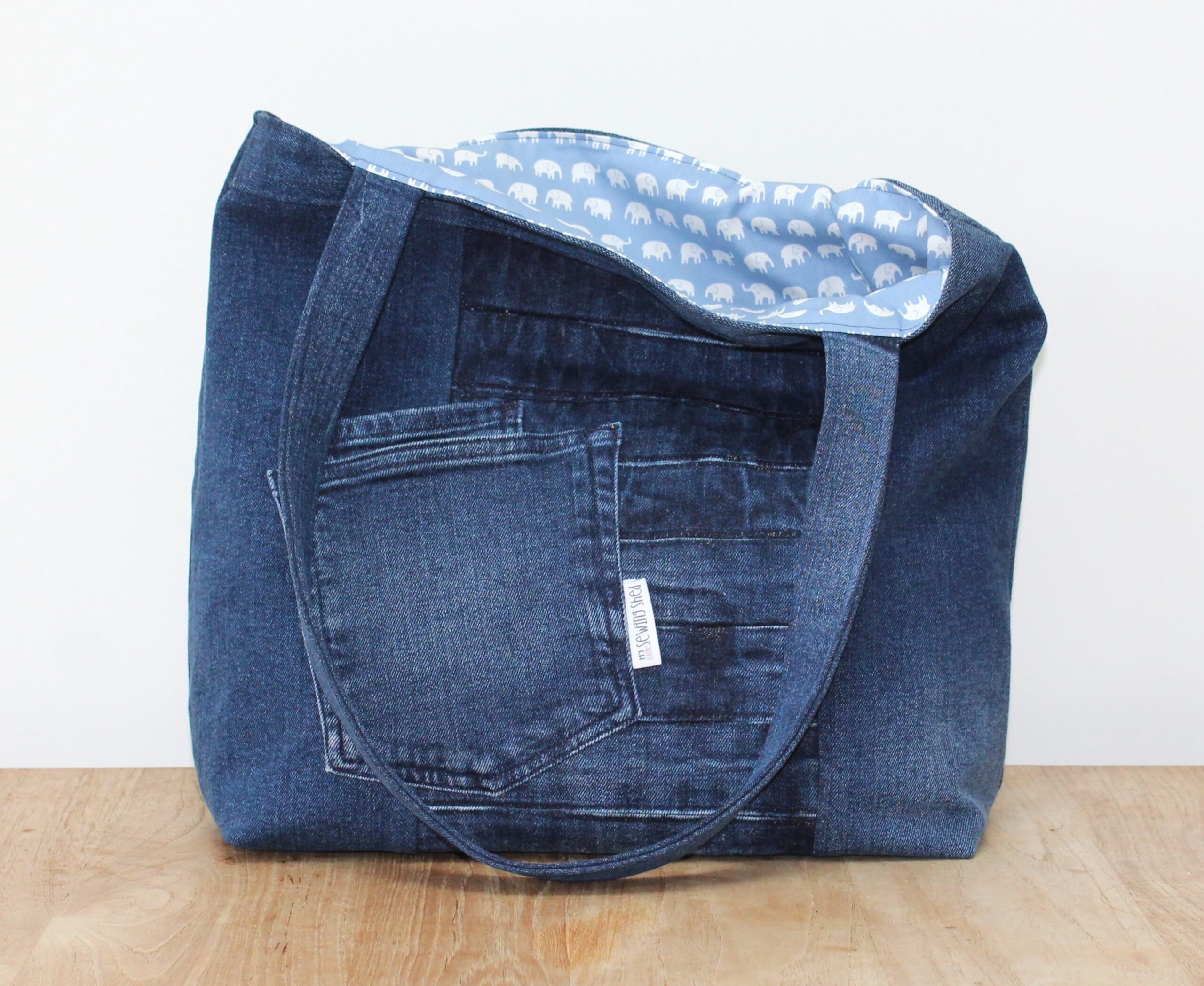 This generous sized, tote style, shoulder bag has been created using recycled blue denim on the outside, whilst inside it is lined with a blue and white elephant print cotton and has an internal pocket lined with blue spotty cotton. There are two pockets on the front.
