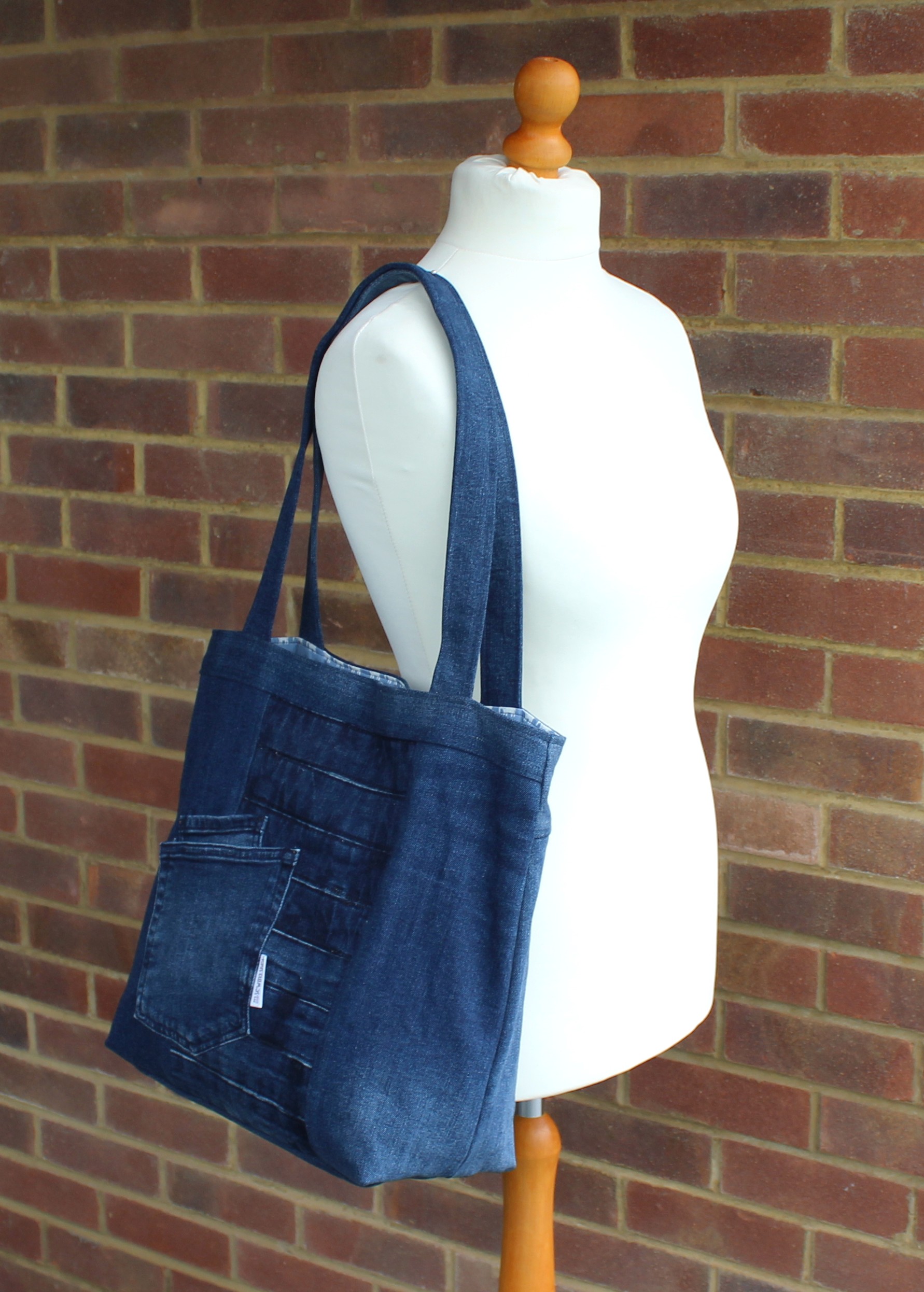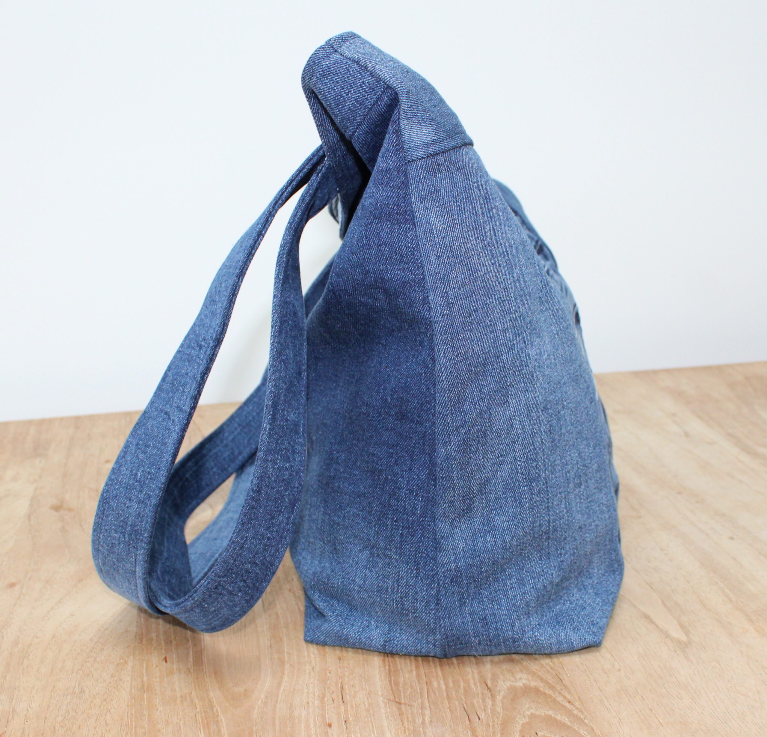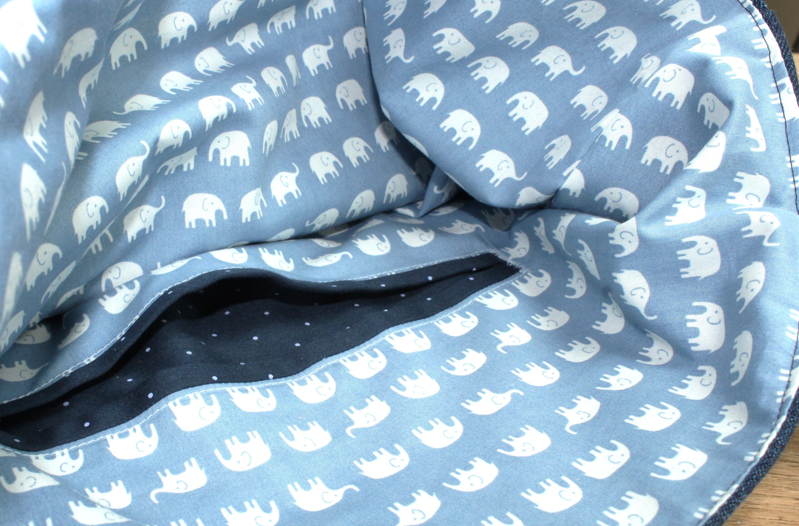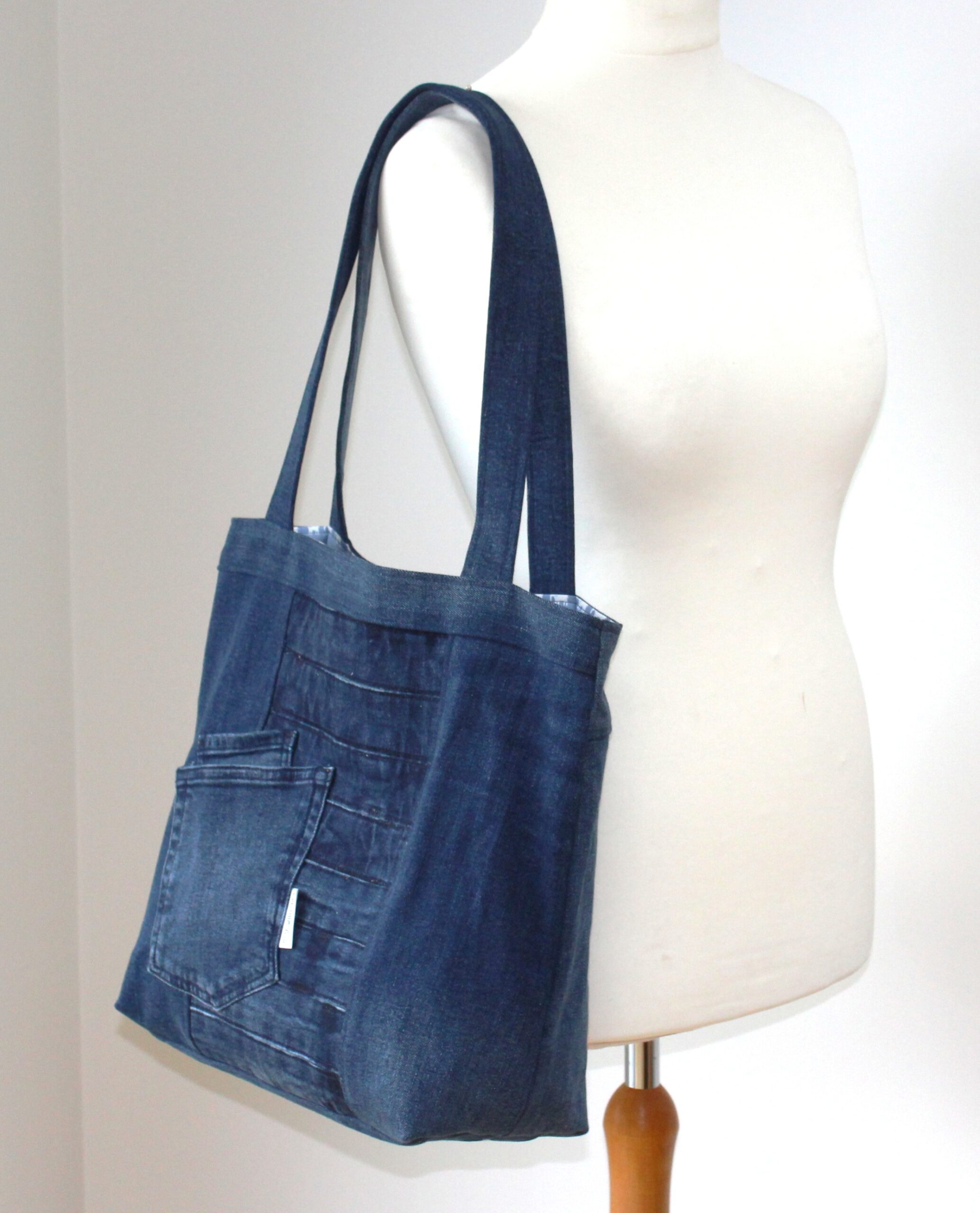 This generous sized, tote style, shoulder bag has been created using recycled blue denim on the outside, whilst inside it is lined with a blue and white elephant print cotton and has an internal pocket lined with blue spotty cotton. There are two pockets on the front.
