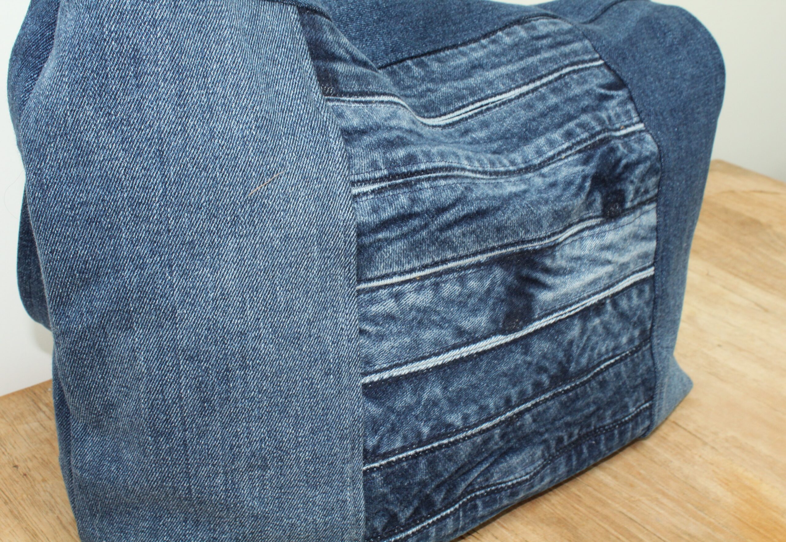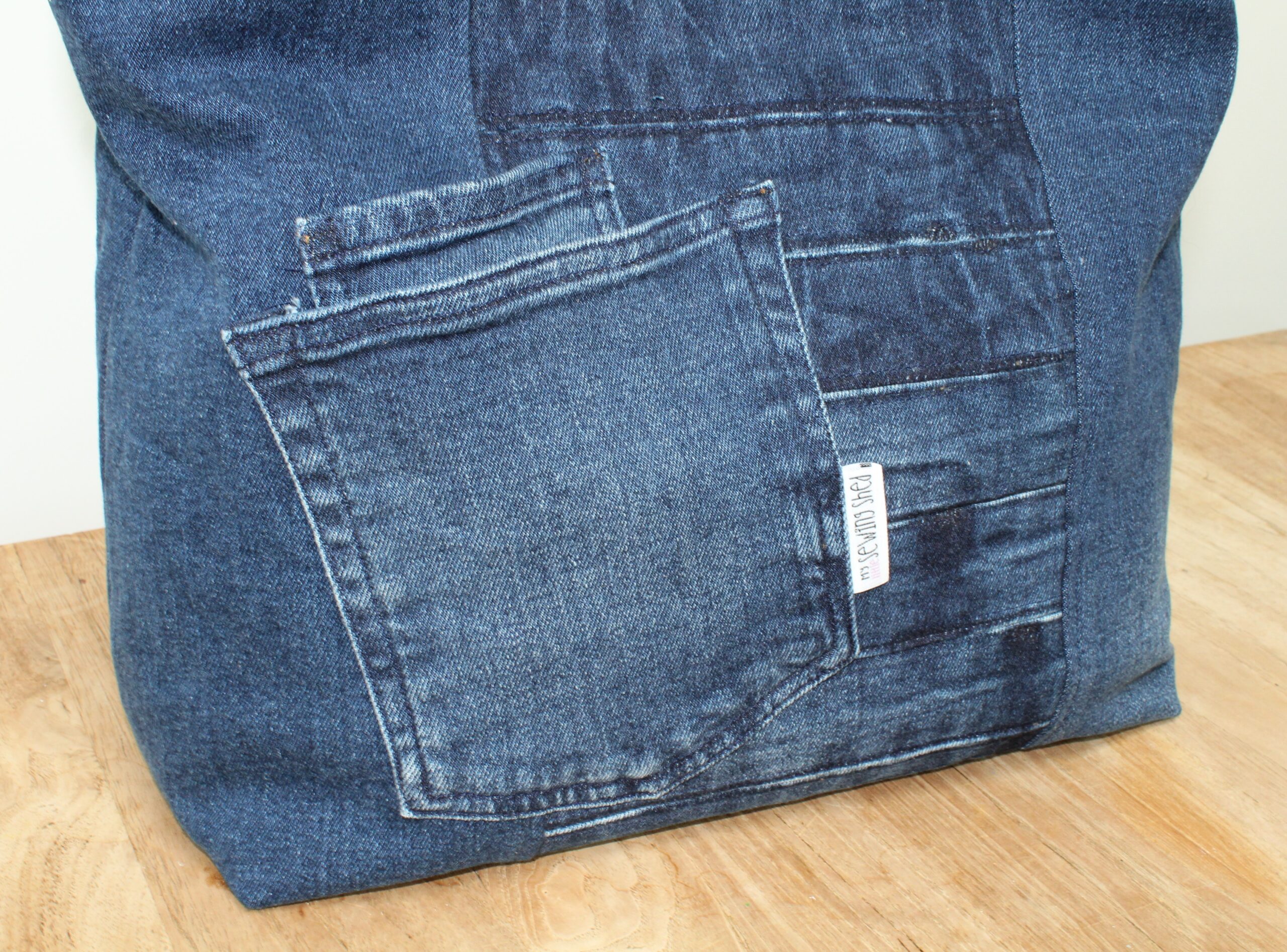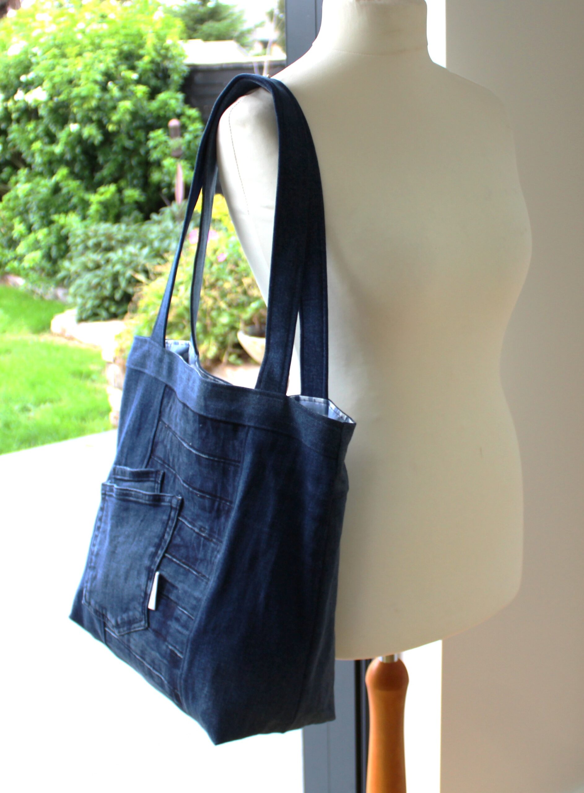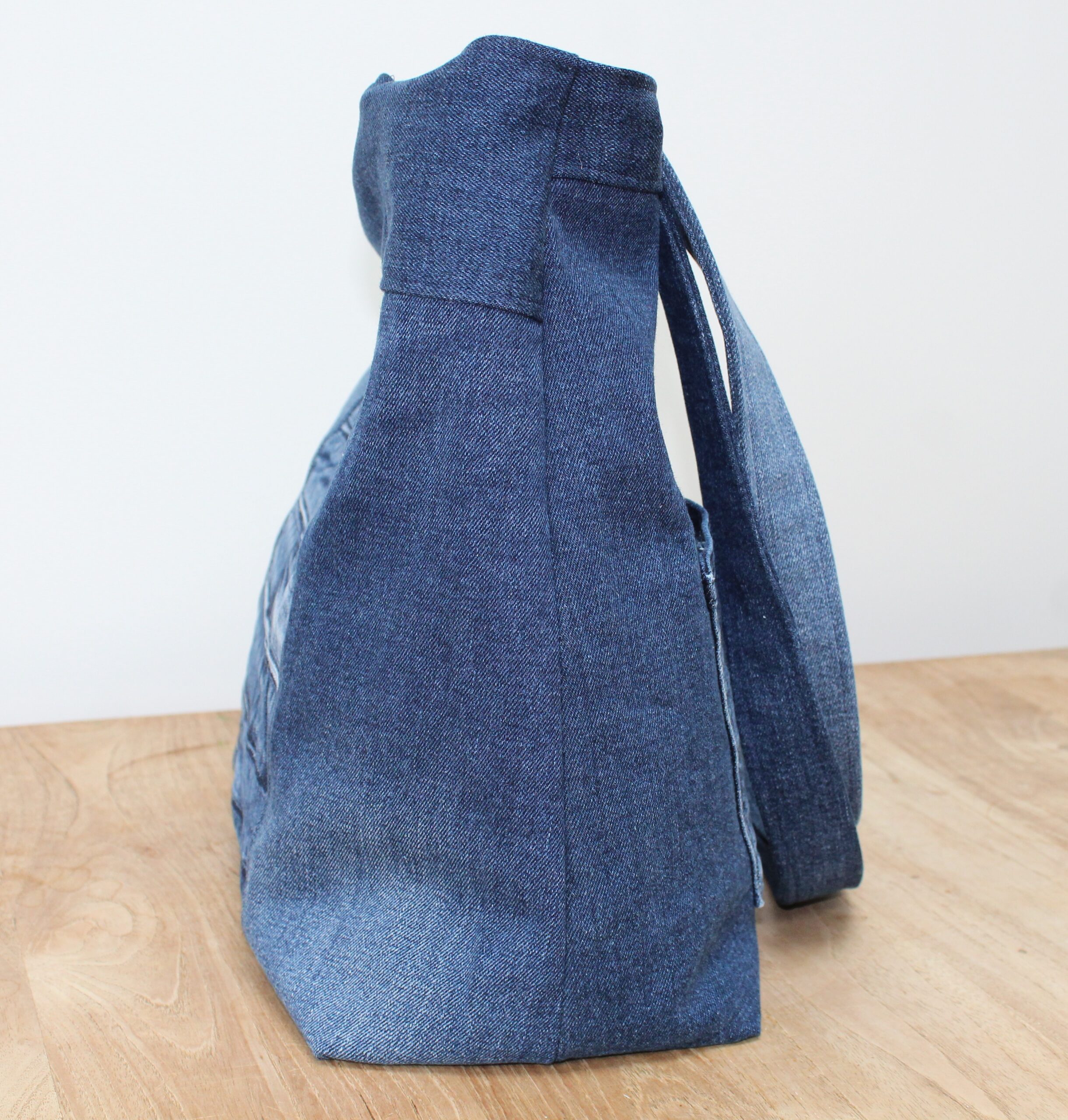 This generous sized, tote style, shoulder bag has been created using recycled blue denim on the outside, whilst inside it is lined with a blue and white elephant print cotton and has an internal pocket lined with blue spotty cotton. There are two pockets on the front.